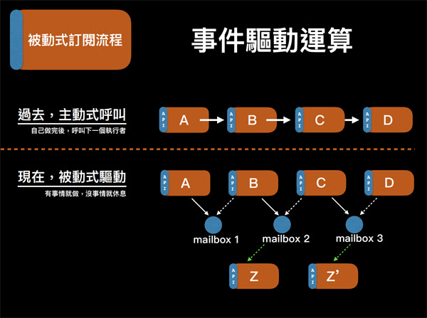 陳榮錡解釋,過去的「主動式呼叫」簡單來說就是「就是自己做完,呼叫下一個執行者。」,而現在的「被動式驅動」作法,則是「有事情就做,沒事情就休息。」的概念